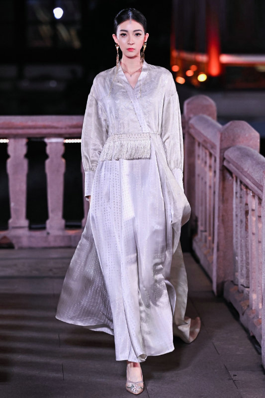 Hosted by Shanghai International Fashion Federation, the show was staged on the garden's Jiuqu (Zigzag) Bridge and Huxin Ting, a pavilion surrounded by a pond.